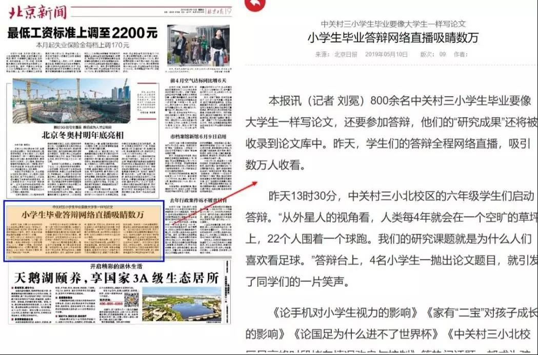 近日,北京市中關村三小北校區(qū)六年級的學生們啟動了畢業(yè)答辯。該次答辯完全模擬大學生答辯過程,研究成果—600份畢業(yè)論文將被收錄到論文庫中,更新穎的是此次答辯還進行了全程在線直播,吸引萬名網(wǎng)友實時圍觀并獲得了一致好評。